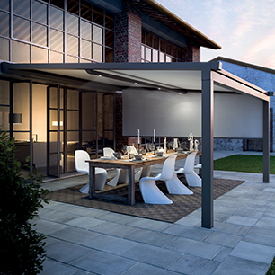 Le caratteristiche costruttive della tenda a pergola con telo retrattile consentono di creare coperture anche di dimensioni notevoli, a moduli affiancabili e con una pendenza minima di soli 7°. A voi resterà solo la gioia di vivere con leggerezza i vostri momenti all’aria aperta.